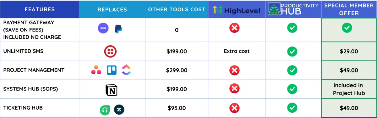 Productivity Hub uses the GHL platform as its base to build upon due to its sturdy reliable functionality. In addition to all the features from GHL, Productivity Hub has added a further 9 features (MMT, Chatbridge, Alternative to Stripe, AI Lead gen, Project Managment, Ticketing system, 700 video/article knowledge bank, 24/7 Live Chat support with a less than 1 minute response time, and 4hrs of live Onboarding, plus 11 more coming in 2025. Additionally, to help you accelerate your success, you will be added to the Productivity Hub Community and be invited to the weekly workshops to make the most out of the platform.
